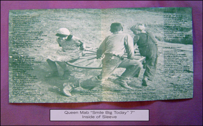 Queen Mab 7" (1994) Judgementil Music 001 Recorded January 1994 Engineered by Kevin Army Produced by Kevin Army and Queen Mab Side 1: Smile Big Today, Depth Side 2: Unbalanced, J Is For Jesus Christ Vinyl: Black Vinyl, Label says 33RPM but record is actually 45RPM Cover: Sealed on left side, opens up with lyrics/etc on inside of sleeve Etchings: Side A: Judementil Music-001-A Kevin Is Rad Side B: Judementil Music-001-B Punks With Presses Is Rad Queen Mab Cover and Vinyl Queen Mab Back Cover Queen Mab Inside Cover |